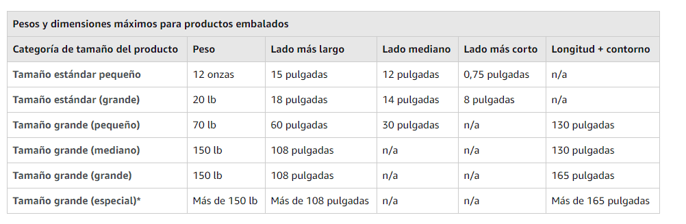 También debemos evitar que nuestro producto tenga piezas sueltas o que se puedan mover, ya que esto siempre dificulta el trasporte y puede repercutir en la calidad y el estado del producto cuando llegue hasta el cliente. Para que te hagas una idea, un producto pequeño, según los estándares de Amazon va de los 38 a 45 centímetros. Aquí también tienes la tabla con todas las medidas.