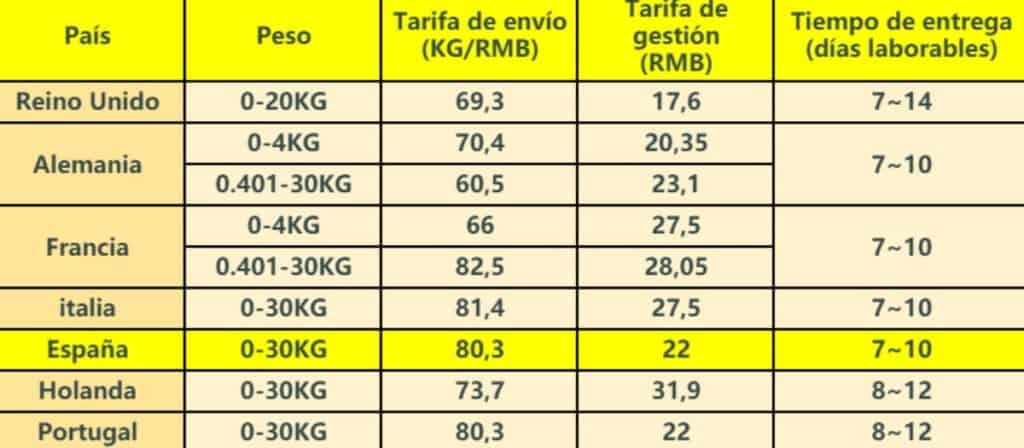 La formula de cálculo sería la siguiente: Peso del paquete x tarifa de envío (KG/RMB)+ Tarifa de gestión (RMB). Por ejemplo, enviar un paquete de 1kg a España nos costaría 80 RMB + 22 RMB = 102 RMB. Lo que es igual a 13 euros.