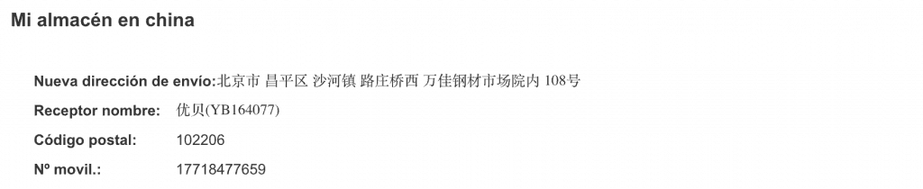 El funcionamiento de Yoybuy es bien sencillo. Al crear tu cuenta en la plataforma te asignarán una dirección en China con un numero exclusivo para ti. Esta dirección personal es la que deberás utilizar a la hora de realizar las compras en las paginas web de China o la que deberás entregar a tus proveedores para que envíen las muestras. La dirección evidentemente está en caracteres chinos para que solamente tengas que copiar y pegar. También te facilitan un numero de móvil para que lo puedas añadir a la hora de realizar las compras online. Sería algo como lo que ves en la siguiente imagen.