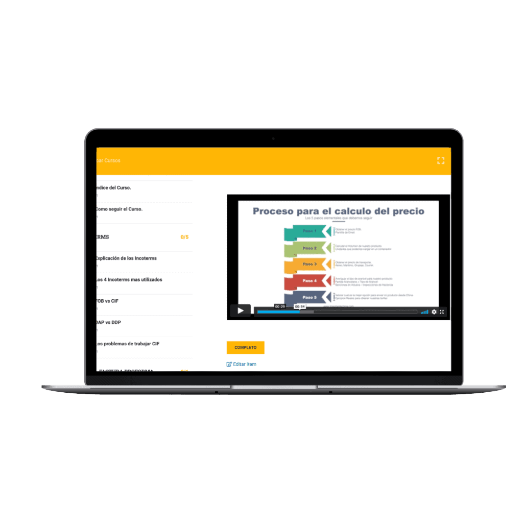 El curso está compuesto de 13 Capítulos con una duración total de más de 4 horas de videos. Con plantillas descargables, hojas de cálculo y ejemplos de cotizaciones de proveedores. Será tu guía durante el proceso de búsqueda y selección de proveedores.